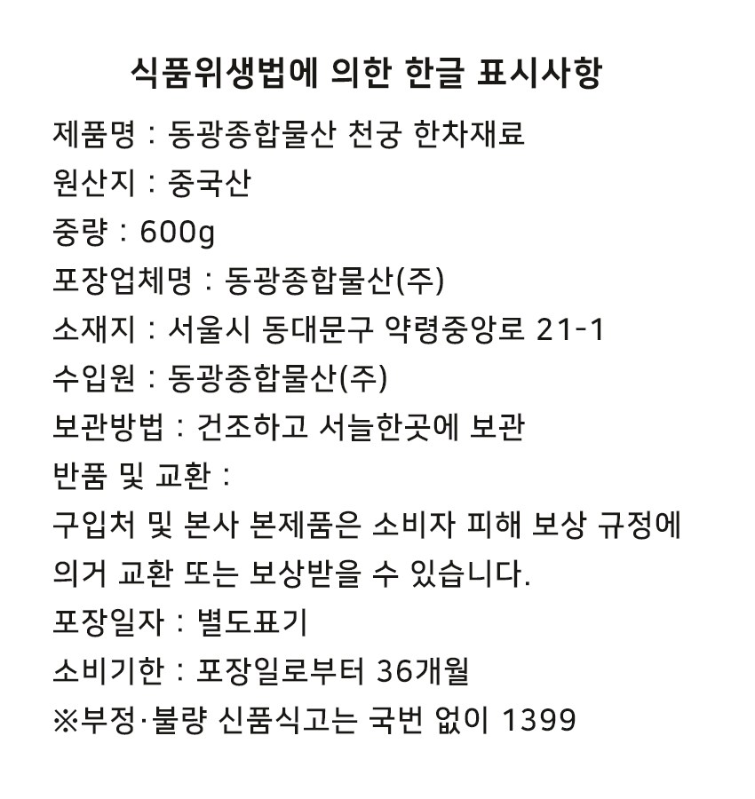| 품목 또는 명칭 | 천궁 소 | 포장단위별 내용물의 용량(중량),수량,크기 | 600g x 2개 |