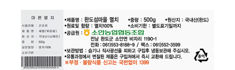 | 제품명 | 완도 섬마을 멸치 | 식품의 유형 | 건포류 |