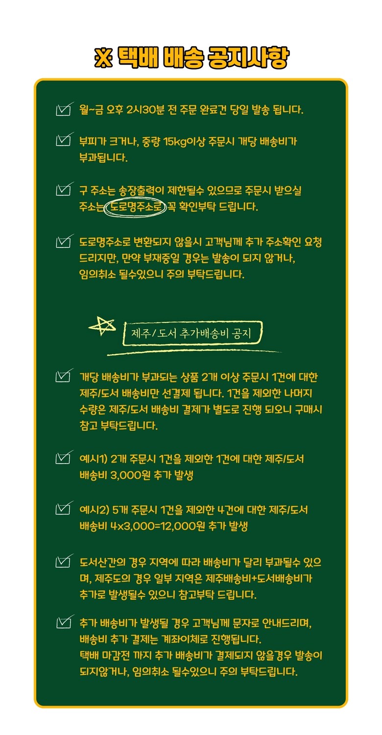 | 배송방법 | 순차배송 | 배송비 | 무료배송 · 도서산간 추가 배송비 - 제주 지역: 3,000원 - 도서산간 지역: 5,000원 |