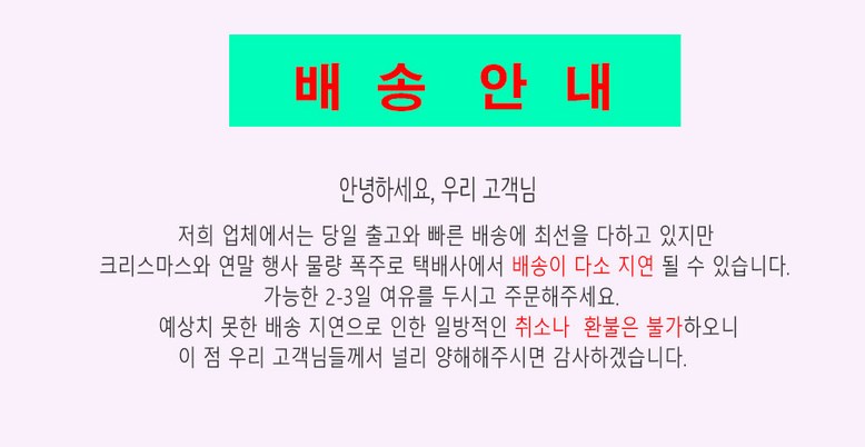 | 배송방법 | 순차배송 | 배송비 | 3,000원 - 도서산간 지역 배송불가 |
