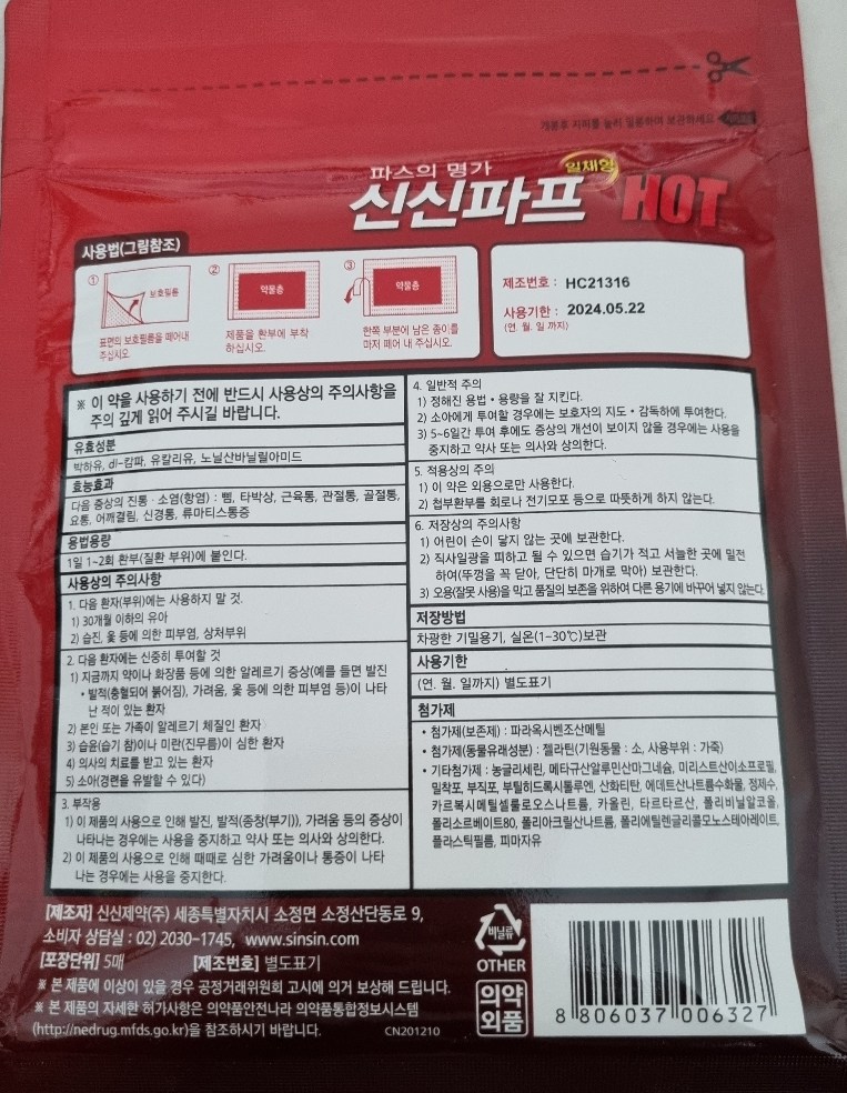 | 품명 및 모델명 | 신신파프 HOT | 인증/허가 사항 | 의약외품 |