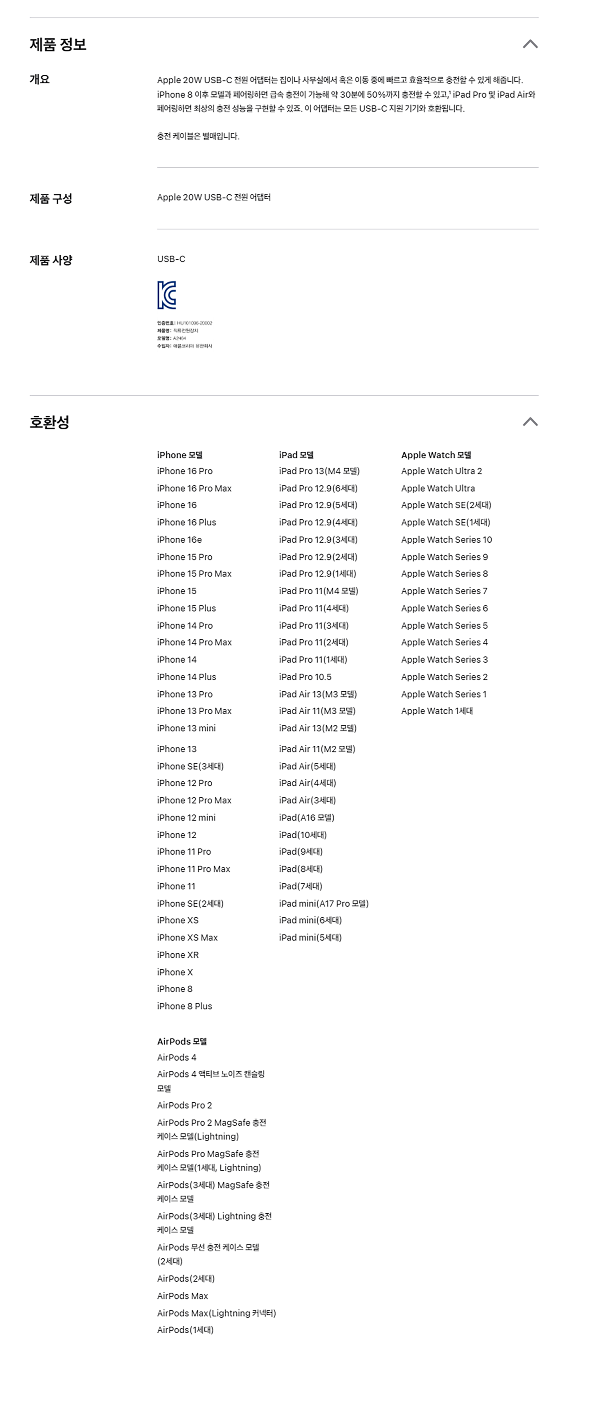 | 품명 및 모델명 | Apple 20W USB-C 전원 어댑터 (MUW13KH/A) / A2464 | KC 인증정보 | HU101096-20002F, R-R-FXV-A2464 |