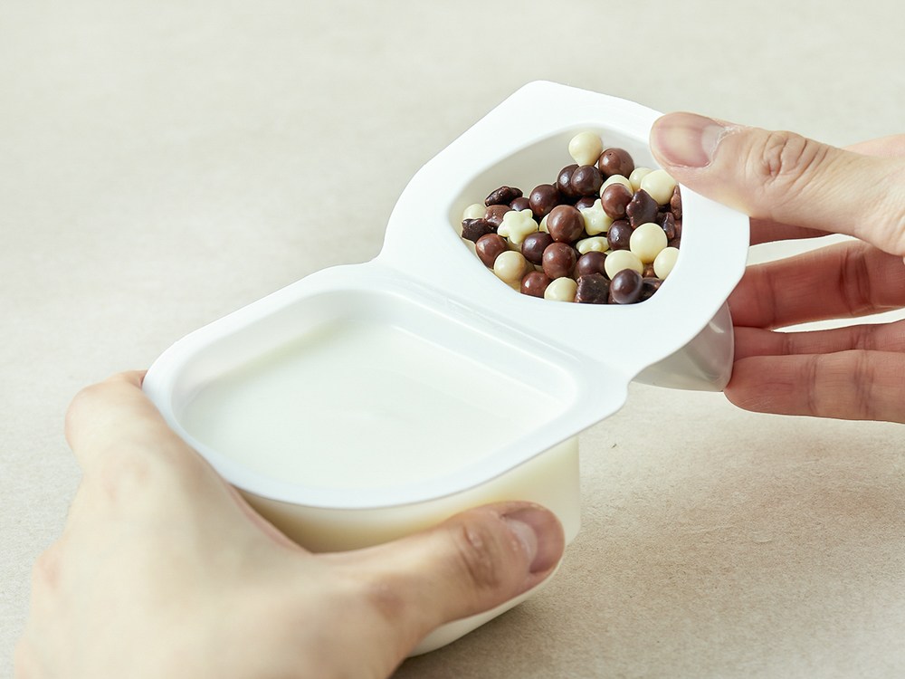 포장을 벗긴 뒤 토핑이 담긴 부분을 톡! 꺾어 요거트 위에 부어주세요. 토핑을 따로 준비할 필요 없이, 바삭한 식감을 즐길 수 있답니다.