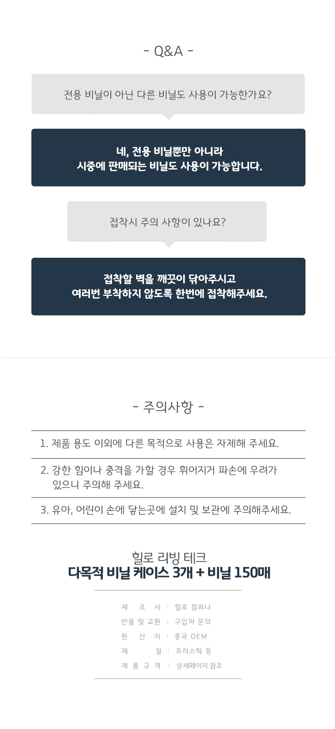| 품명 및 모델명 | 힐로 비닐 봉투 150매 + 전용케이스 3종 | 인증/허가 사항 | 해당 없음 |