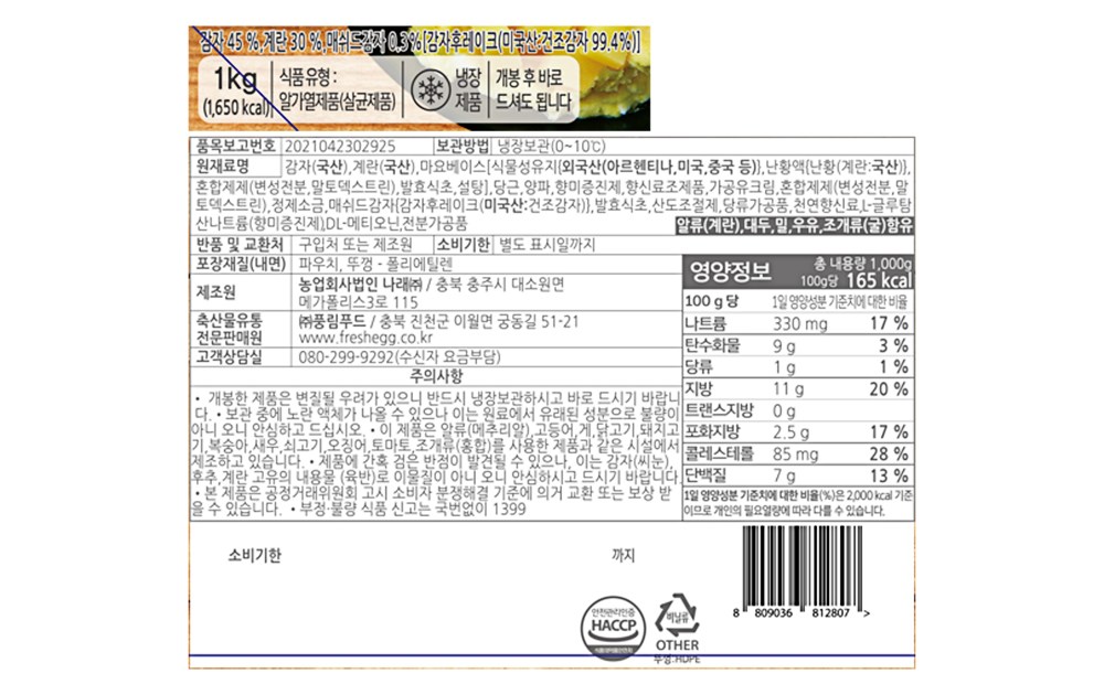 | 제품명 | 짜먹는 감자 에그 샐러드 | 식품의 유형 | 열가열제품(살균제품) |