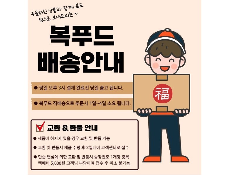 | 배송기간 | ㆍ도서산간 지역 등은 배송에 3-5일이 더 소요될 수 있습니다. - 천재지변, 물량 수급 변동 등 예외적인 사유 발생 시, 다소 지연될 수 있는 점 양해 부탁드립니다. | ||