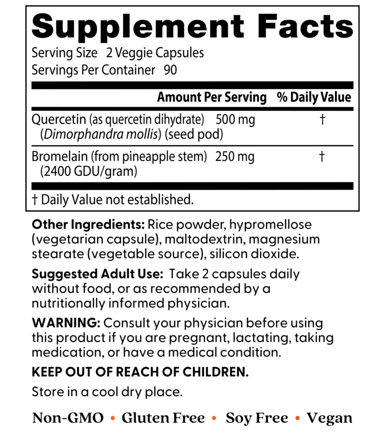 바이오플라보노이드인 케르세틴이 함유된 식이 보충제입니다. 1회 제공량 당 500mg의 케르세틴과 250mg인 브로멜라인을 함유하고 있습니다.