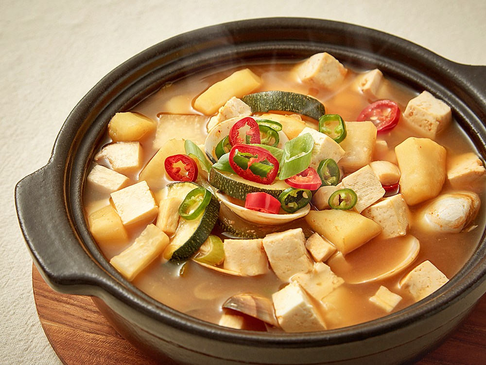재료: 두부 100 g, 된장 2큰술, 멸치 육수 3컵, 고춧가루 약간, 무 적당량, 청양고추 1개, 애호박 적당량, 팽이버섯 20 g, 대파 약간