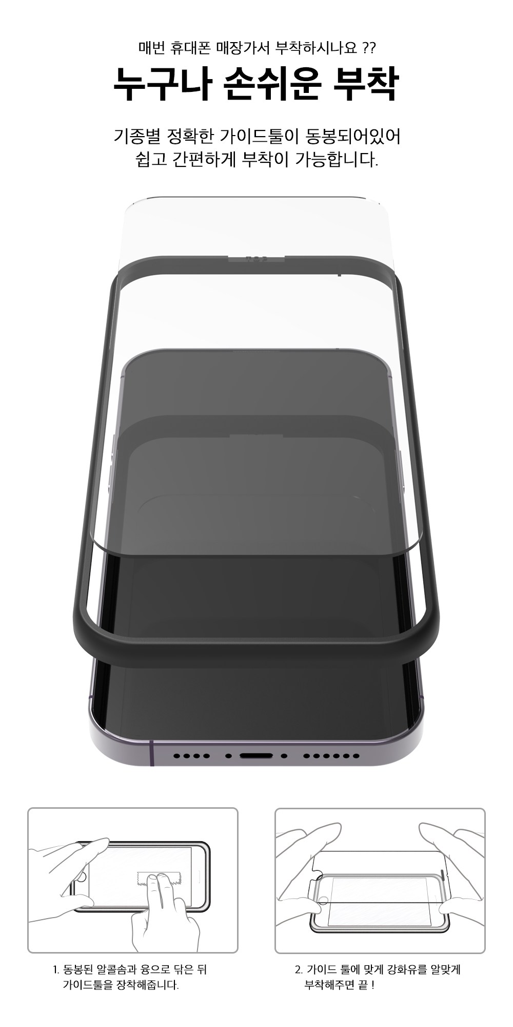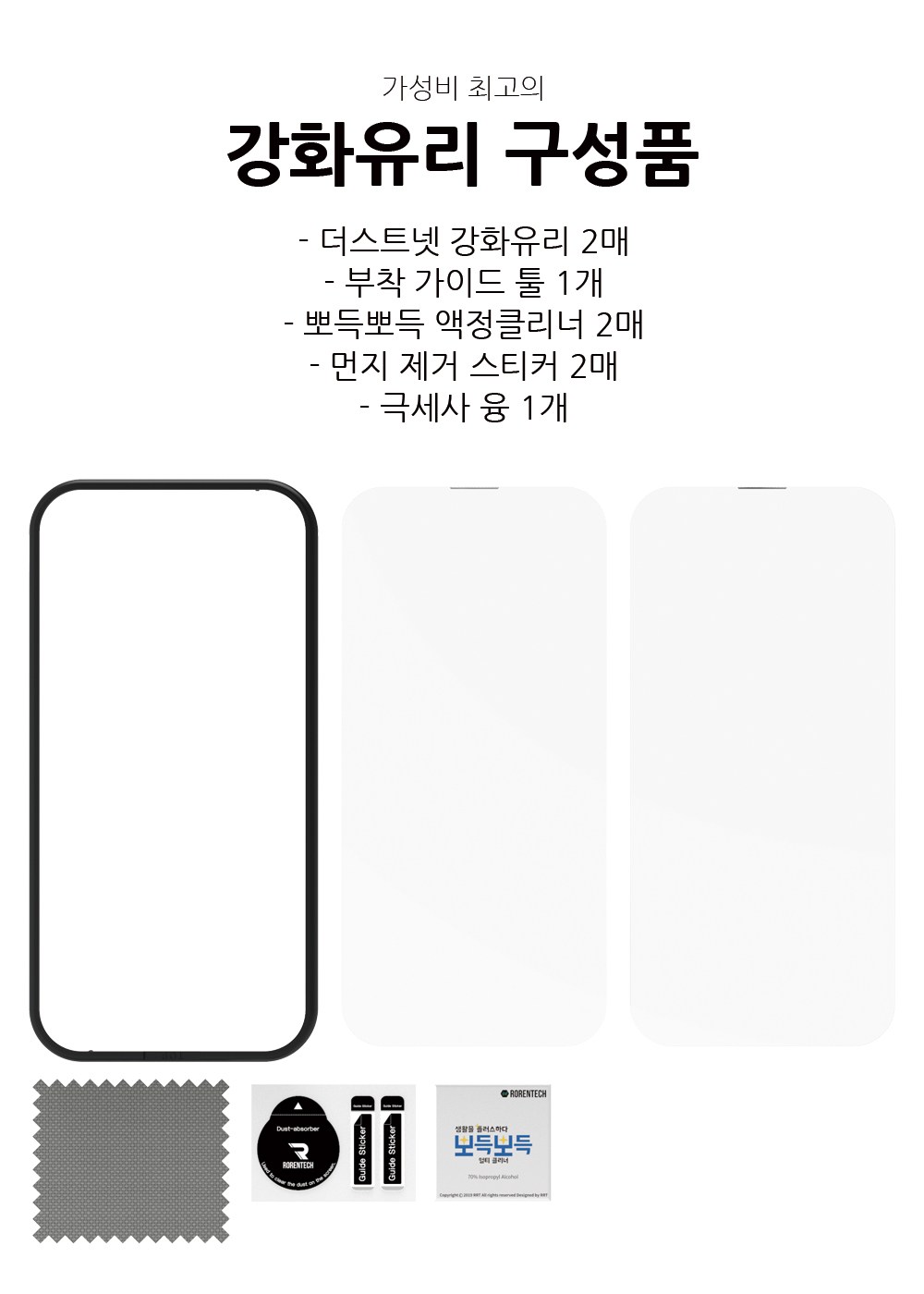 | 품명 및 모델명 | 강화유리 휴대폰 액정보호필름 세트 | 인증/허가 사항 | 본품: 해당없음, 크리너: EB19-01-0652 |