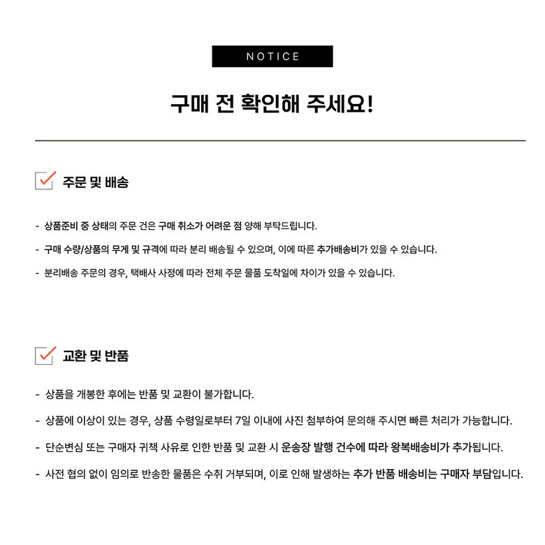 | 교환/반품 비용 (왕복비용) | 6,000원 - 단, 고객 변심의 경우에만 발생 - 도서산간 지역 배송불가 |