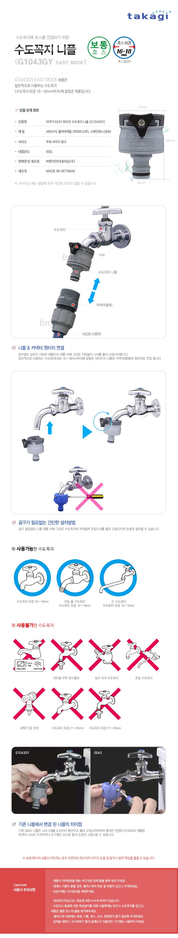 | 품명 및 모델명 | TAKAGI 타카기 이지락 수도꼭지니플 G1043GY | 인증/허가 사항 | 해당없음 |