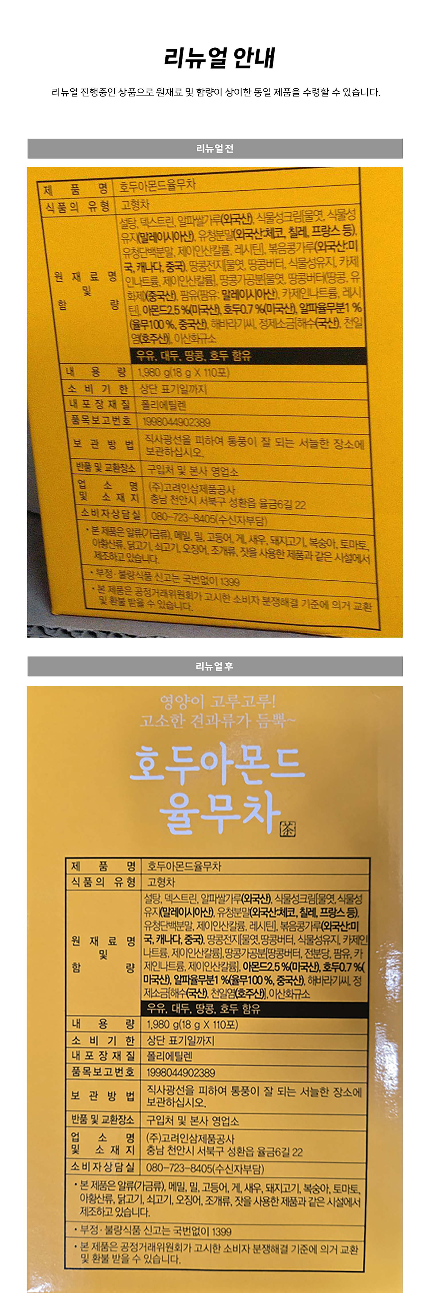 | 포장단위별 내용물의 용량(중량), 수량 | 1,980g x 2개 | 원재료명 및 함량 | 리뉴얼 전, 후: 컨텐츠 참조 |