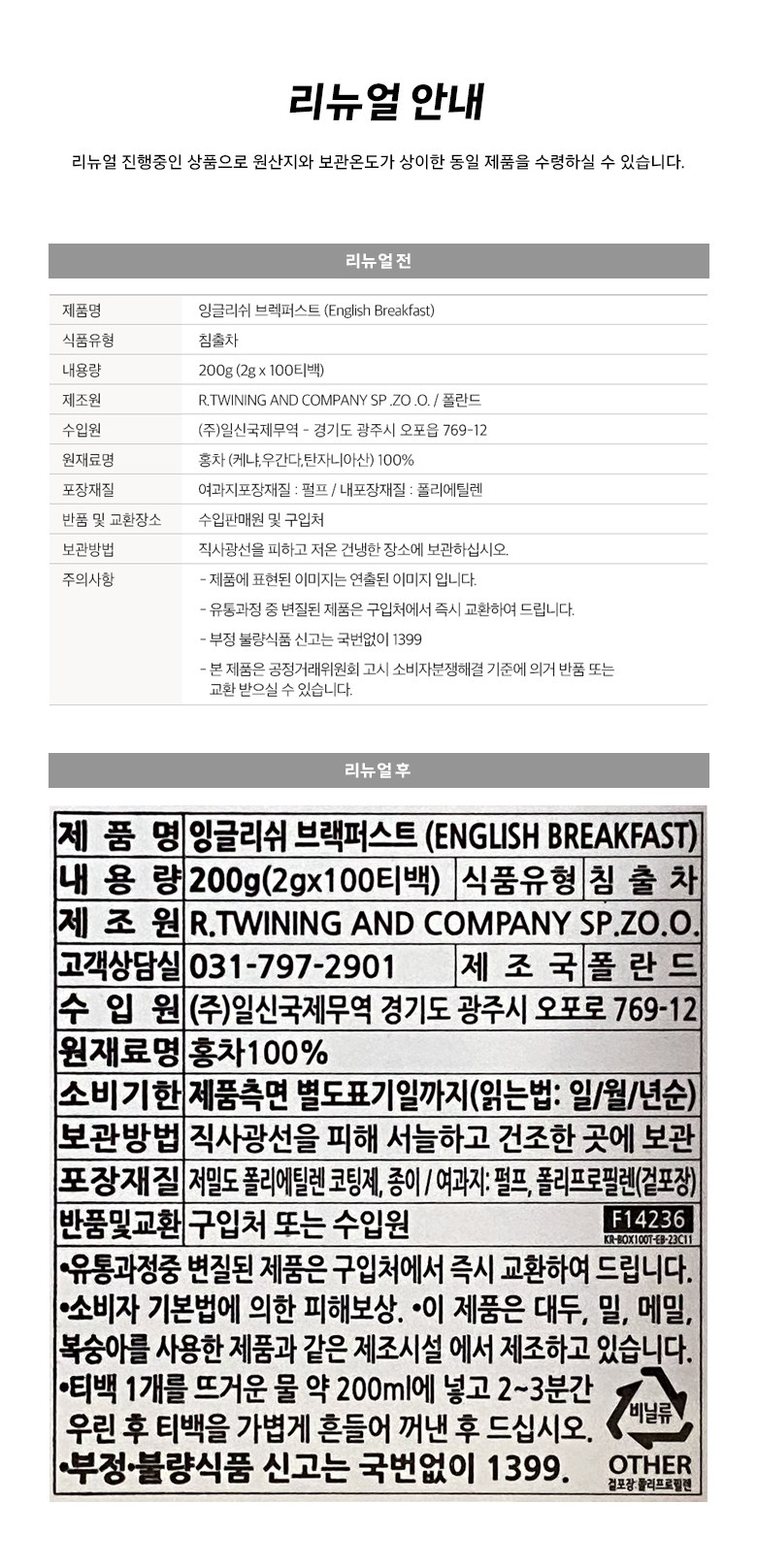 | 제품명 | 잉글리쉬 브랙퍼스트(ENGLISH BREAKFAST TEA) | 식품의 유형 | 침출차 |