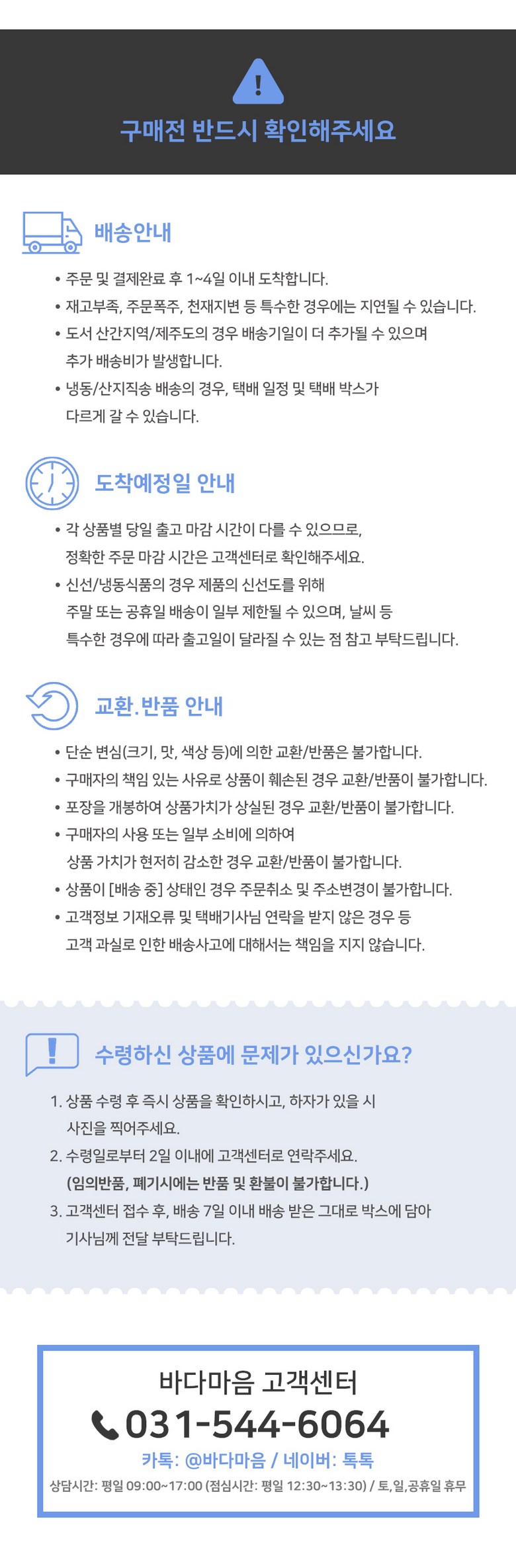 - ㆍ교환/반품에 관한 일반적인 사항은 판매자가 제시사항보다 관계법령이 우선합니다.
