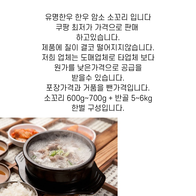 | 품목 또는 명칭 | 한우 소꼬리 + 엉치뼈 셋트 | 포장단위별 내용물의 용량(중량),수량,크기 | 6kg내외, 한벌 |