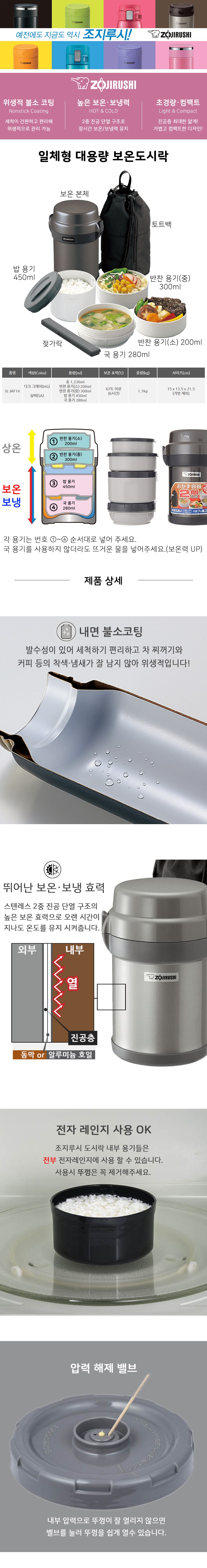 | 구성품 | 보온본체, 젓가락, 반찬용기2개, 밥 용기, 국통 용기, 토트백 | 크기 | 컨텐츠 참조 |