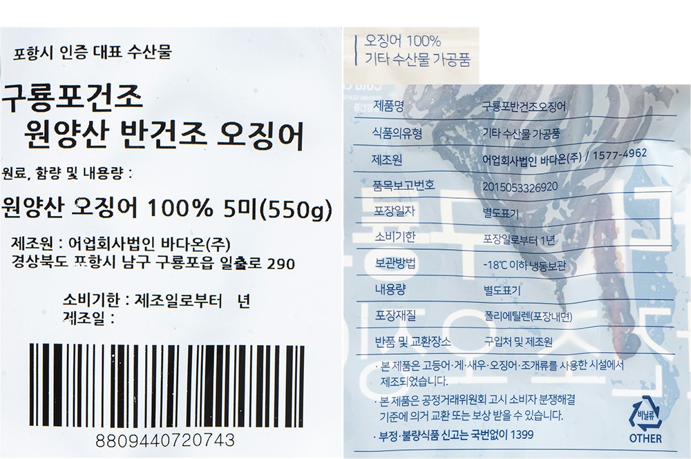 | 품목 또는 명칭 | 구룡포건조 원양산 반건조 오징어 | 포장단위별 내용물의 용량(중량),수량,크기 | 550g (5미) x 2개,1개 |