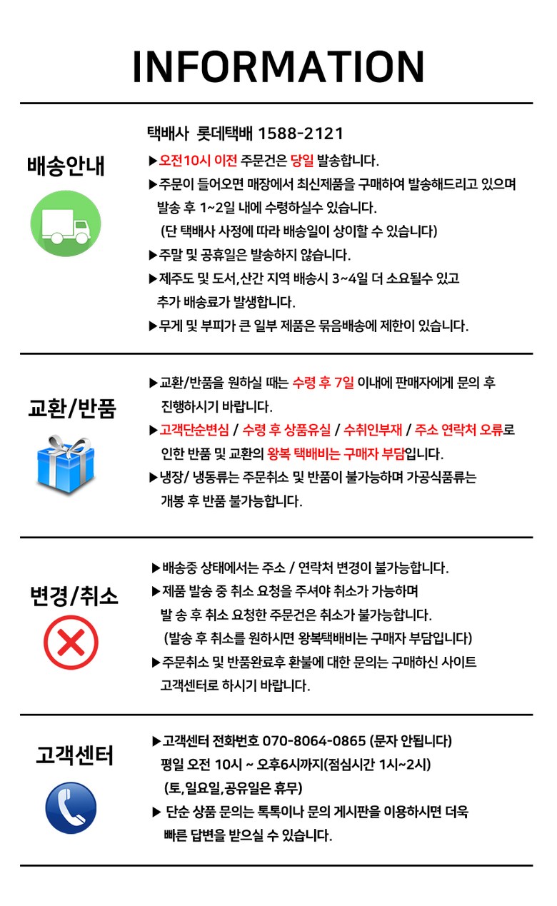 - ㆍ교환/반품에 관한 일반적인 사항은 판매자가 제시사항보다 관계법령이 우선합니다.