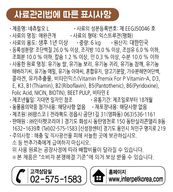 | 품명 및 모델명 | 네츄럴오 L | 인증/허가 사항 | 사료관리법에 따른 성분등록번호 : 컨텐츠 참조 |