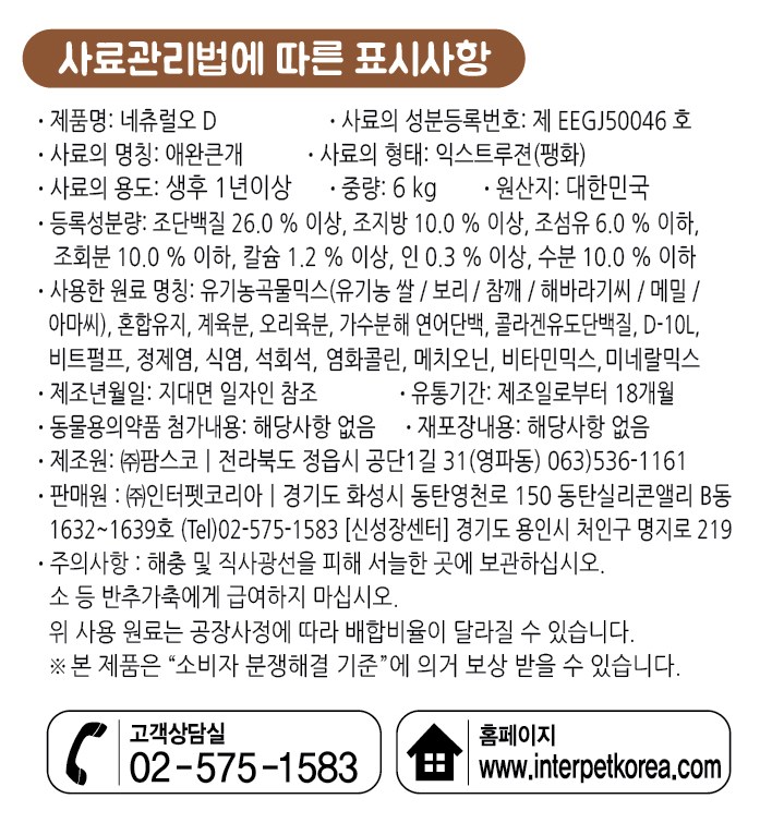 | 품명 및 모델명 | 네츄럴오 D | 인증/허가 사항 | 사료관리법에 따른 성분등록번호 : 컨텐츠 참조 |