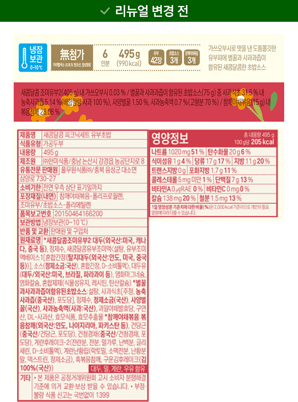 | 포장단위별 내용물의 용량(중량), 수량 | 495g x 1개 | 원재료명 및 함량 | 컨텐츠 참조 |