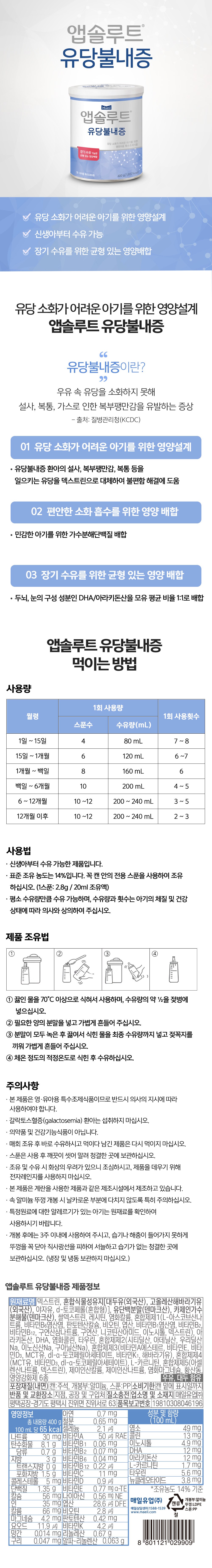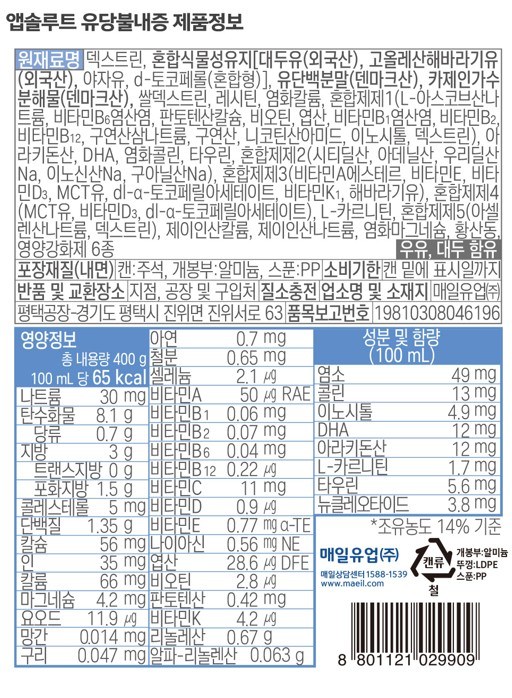 | 제품명 | 앱솔루트 유당불내증 | 식품의 유형 | 영유아용 특수조제식품 |