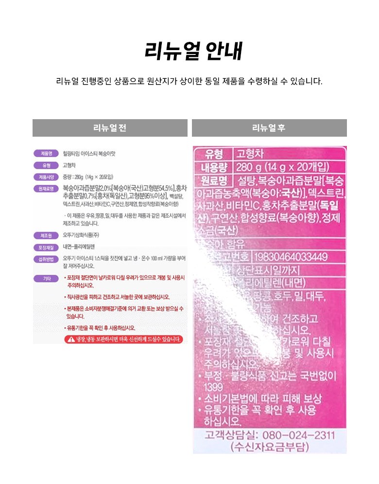 ※ 리뉴얼 진행중인 상품으로 "소비기한 또는 유통기한" 이 표시된 제품을 수령하실 수 있습니다.