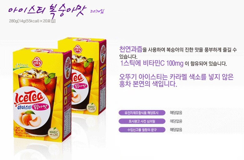 | 제품명 | 힐링타임 아이스티 복숭아맛 | 식품의 유형 | 고형차 |