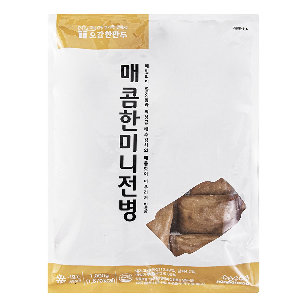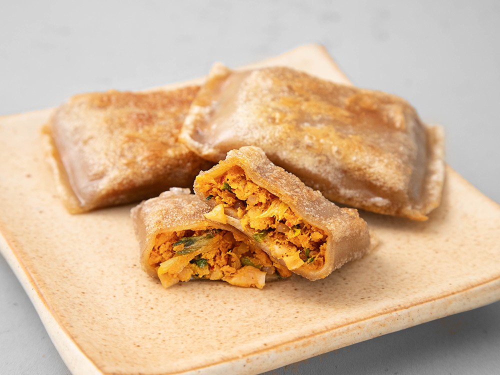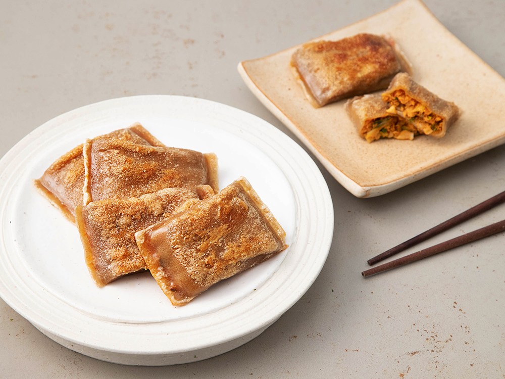 먹기 좋은 크기로 먹음직스럽게 빚은 미니전병이에요. 돼지고기, 김치를 사용한 소를 쫄깃한 피에 채웠죠. 노릇하게 조리해 한 입 먹으면, 매콤하면서도 고소한 풍미가 입안 가득 퍼진답니다. 여기에 김치와 건무의 아삭하고 꼬들꼬들한 식감까지 살아있어요.