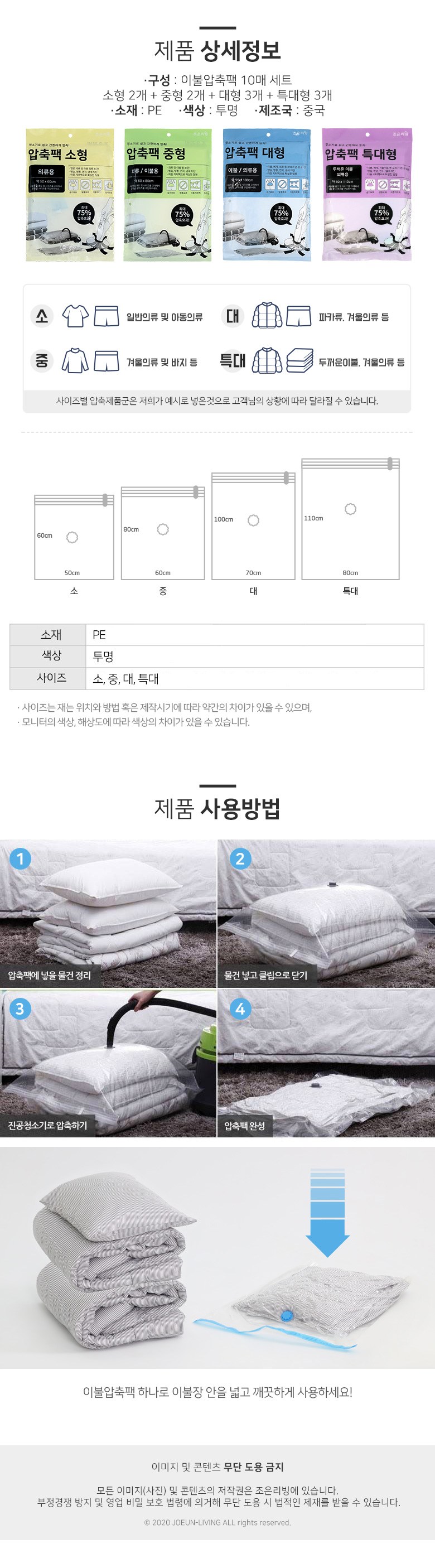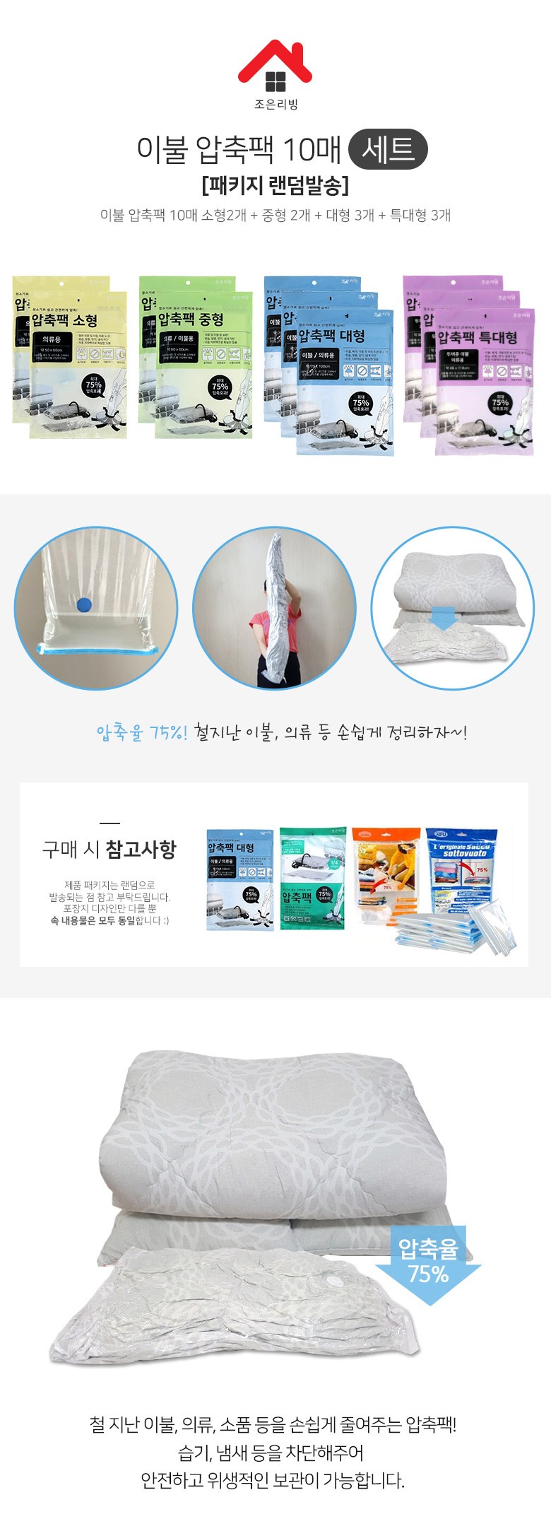 | 품명 및 모델명 | 이불압축팩(소형 2p + 중형 2p + 대형 3p + 특대형 3p) | 인증/허가 사항 | 해당없음 |