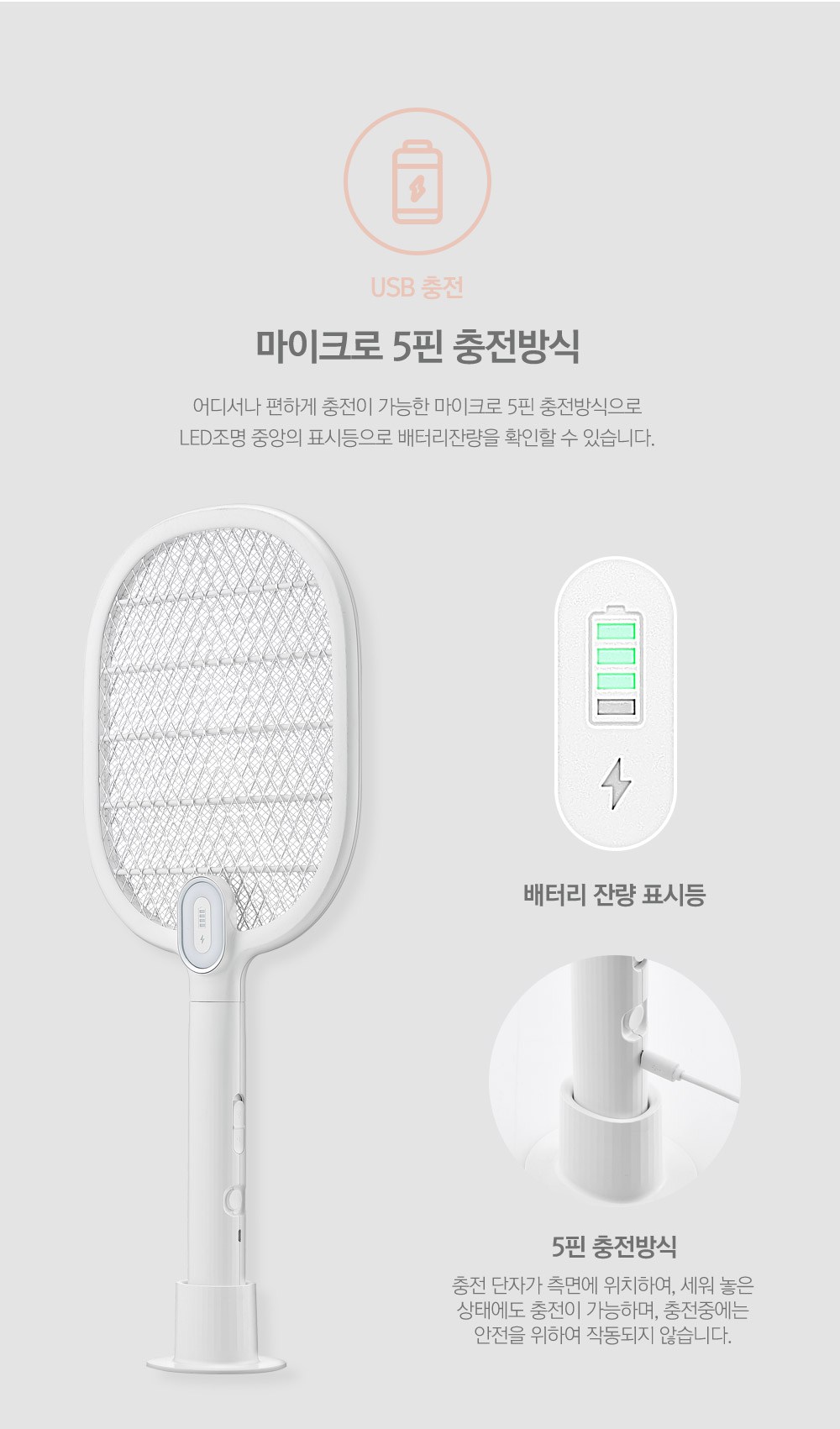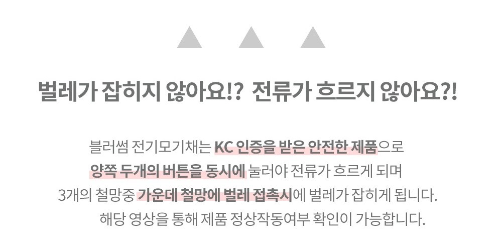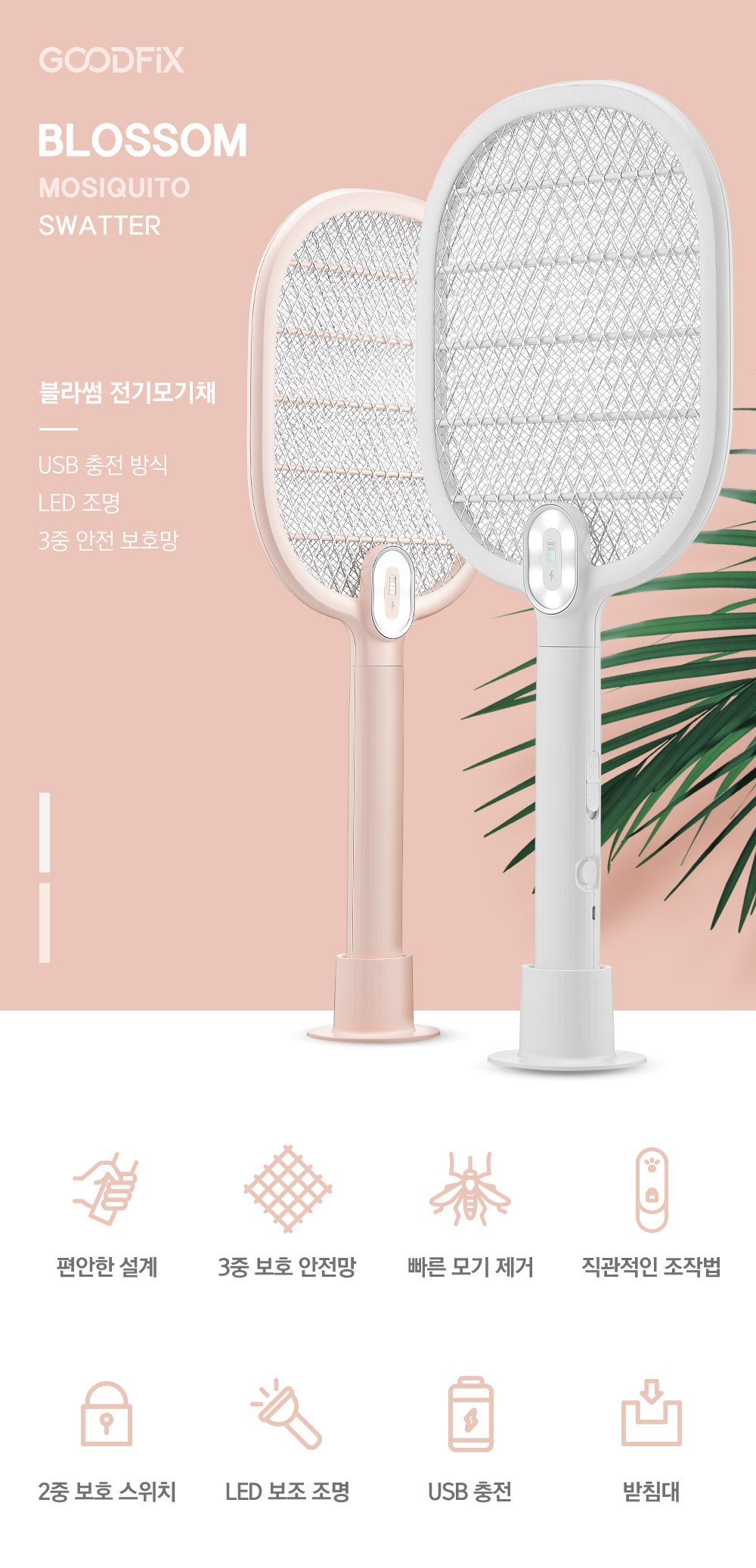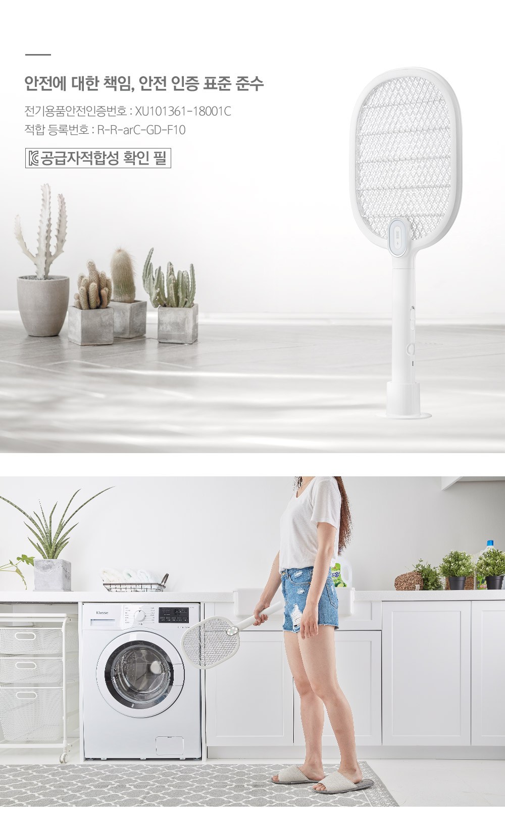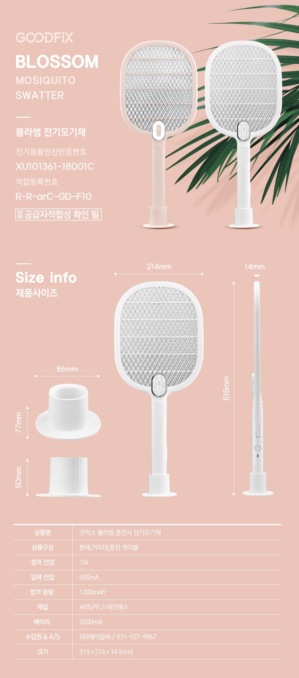 | 품명 및 모델명 | 블러썸 충전식 전기모기채 / 모델명: GD-F10 | 인증/허가 사항 | 본품: 유/KC마크, R-R-arC-GD-F10/ 배터리 : XU101361-18001C |
