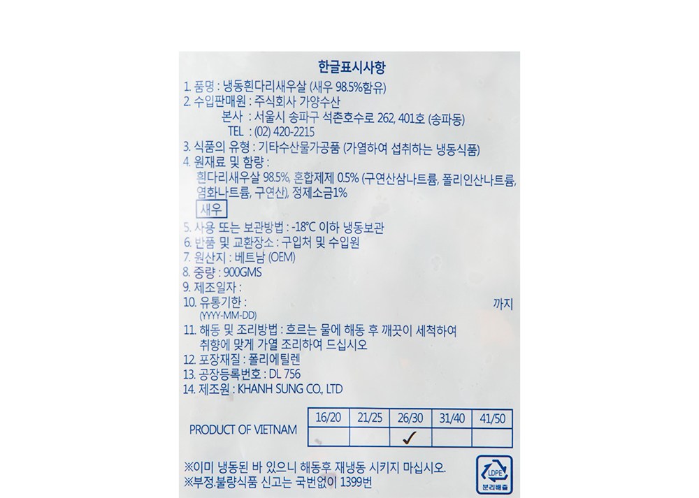 | 생산자 및 소재지 | KHANH SUNG CO., LTD / 주식회사 가양수산 / 베트남 | 소비기한 또는 품질유지기한 | 소비기한(또는 유통기한) : 2028년 10월 22일 이거나 그 이후인 상품 |