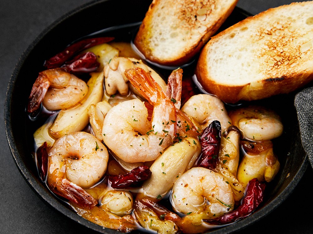 재료: 새우 15마리, 마늘 10쪽, 올리브유 1컵, 페퍼론치노 4개, 바게트 적당량, 소금, 후추 적당량