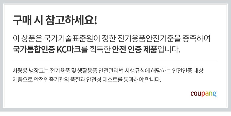 | 품명 및 모델명 | 알피쿨 DC AC 겸용 차량용 냉장고/ K25 | KC 인증정보 | 본품: R-R-JCa-K25 / 어댑터: HU10379-16023A |