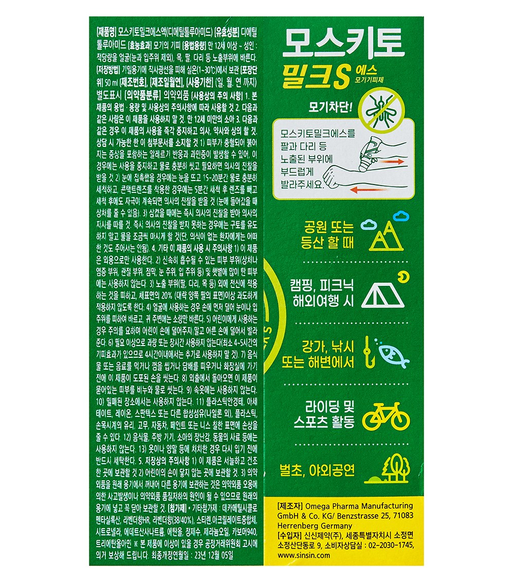| 품명 및 모델명 | 모스키토밀크에스액(디에틸톨루아미드) | 인증/허가 사항 | 의약외품 |