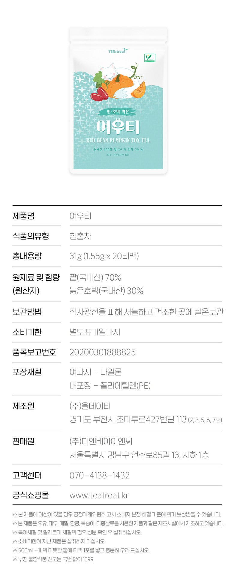 | 제품명 | 여우티 호박팥차 | 식품의 유형 | 침출차 |