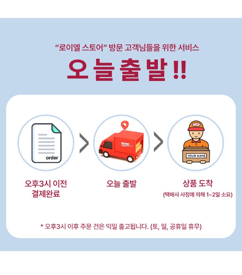 | 배송기간 | ㆍ도서산간 지역 등은 배송에 3-5일이 더 소요될 수 있습니다. - 천재지변, 물량 수급 변동 등 예외적인 사유 발생 시, 다소 지연될 수 있는 점 양해 부탁드립니다. | ||