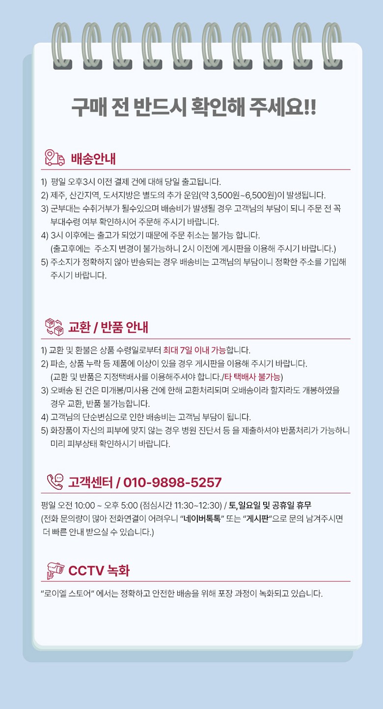 - ㆍ모니터 해상도의 차이로 인해 색상이나 이미지가 실제와 달라, 고객이 단순 변심으로 교환/반품을 무료로 요청하는 경우