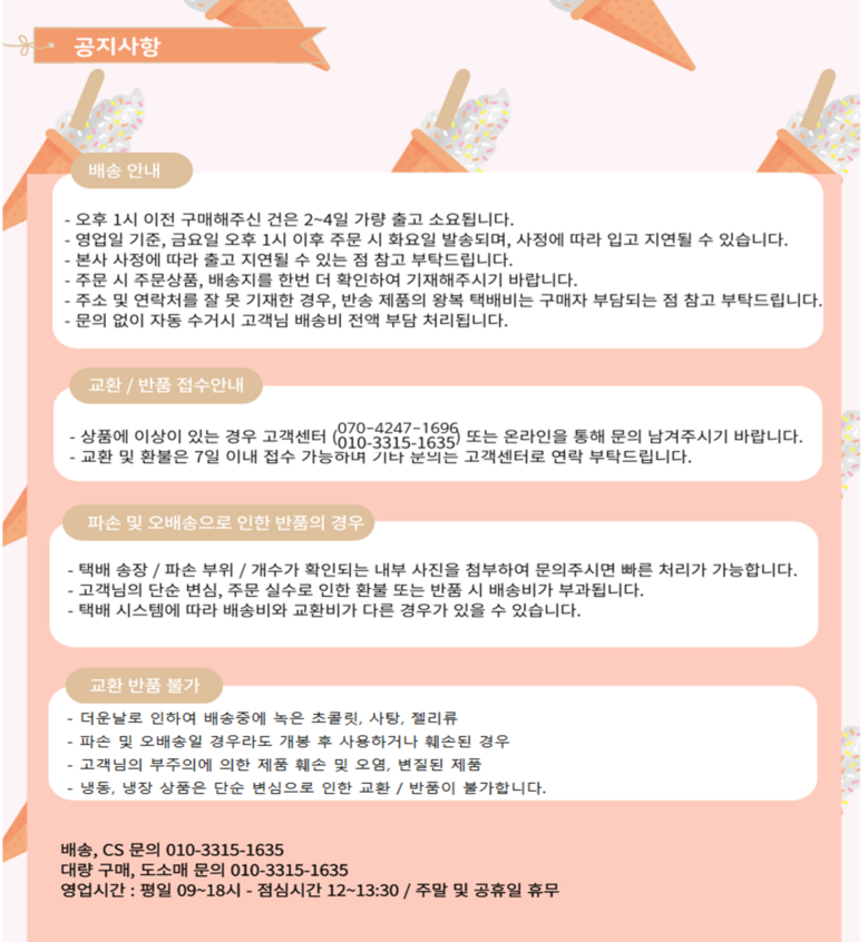 - ㆍ모니터 해상도의 차이로 인해 색상이나 이미지가 실제와 달라, 고객이 단순 변심으로 교환/반품을 무료로 요청하는 경우