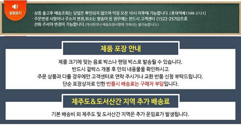 | 배송기간 | ㆍ도서산간 지역 등은 배송에 3-5일이 더 소요될 수 있습니다. - 천재지변, 물량 수급 변동 등 예외적인 사유 발생 시, 다소 지연될 수 있는 점 양해 부탁드립니다. | ||