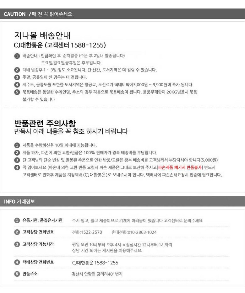 - ㆍ교환/반품에 관한 일반적인 사항은 판매자가 제시사항보다 관계법령이 우선합니다.
