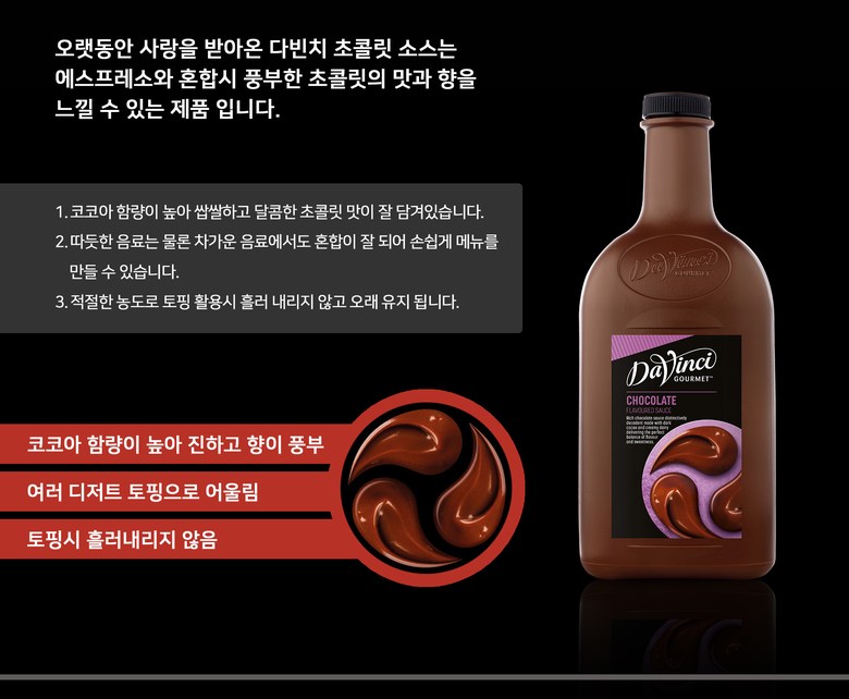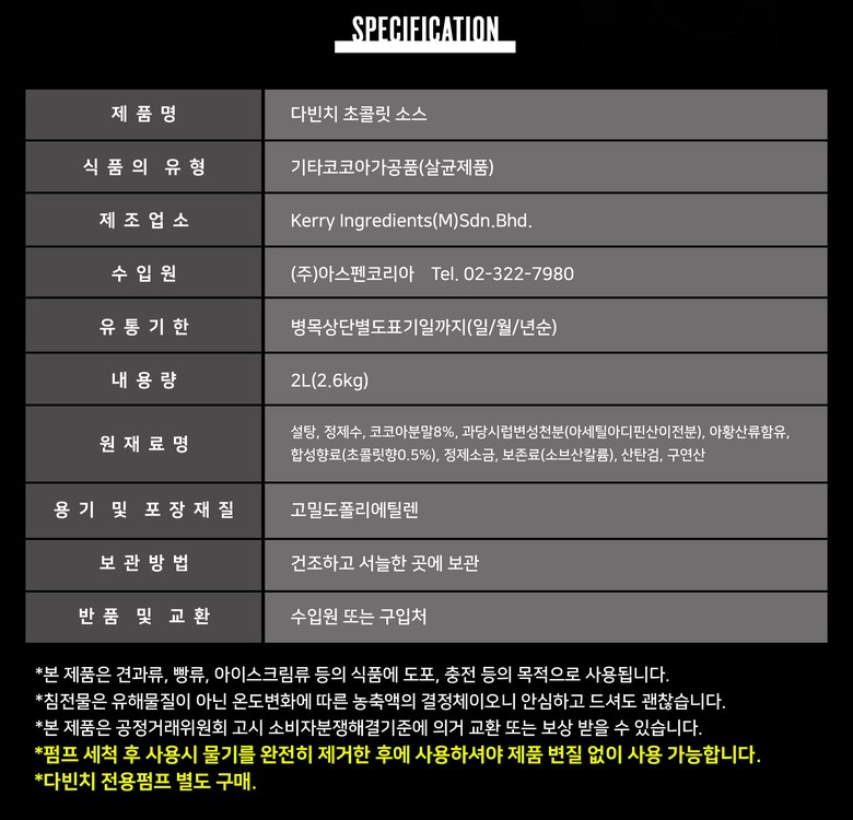 | 제품명 | 다빈치 초콜릿소스 2.6kg 2개 | 식품의 유형 | 다빈치 초콜릿소스 2.6kg 2개 |