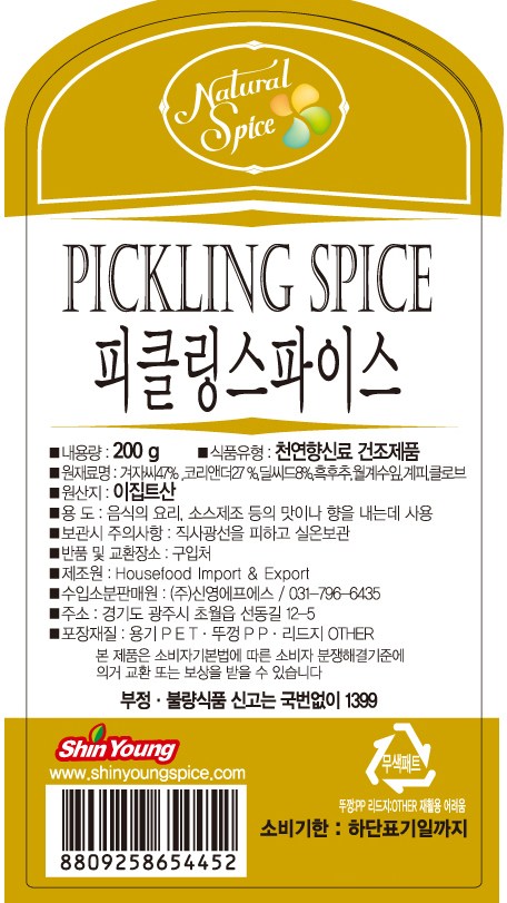 | 제품명 | 피클링 스파이스 | 식품의 유형 | 천연향신료건조제품 |