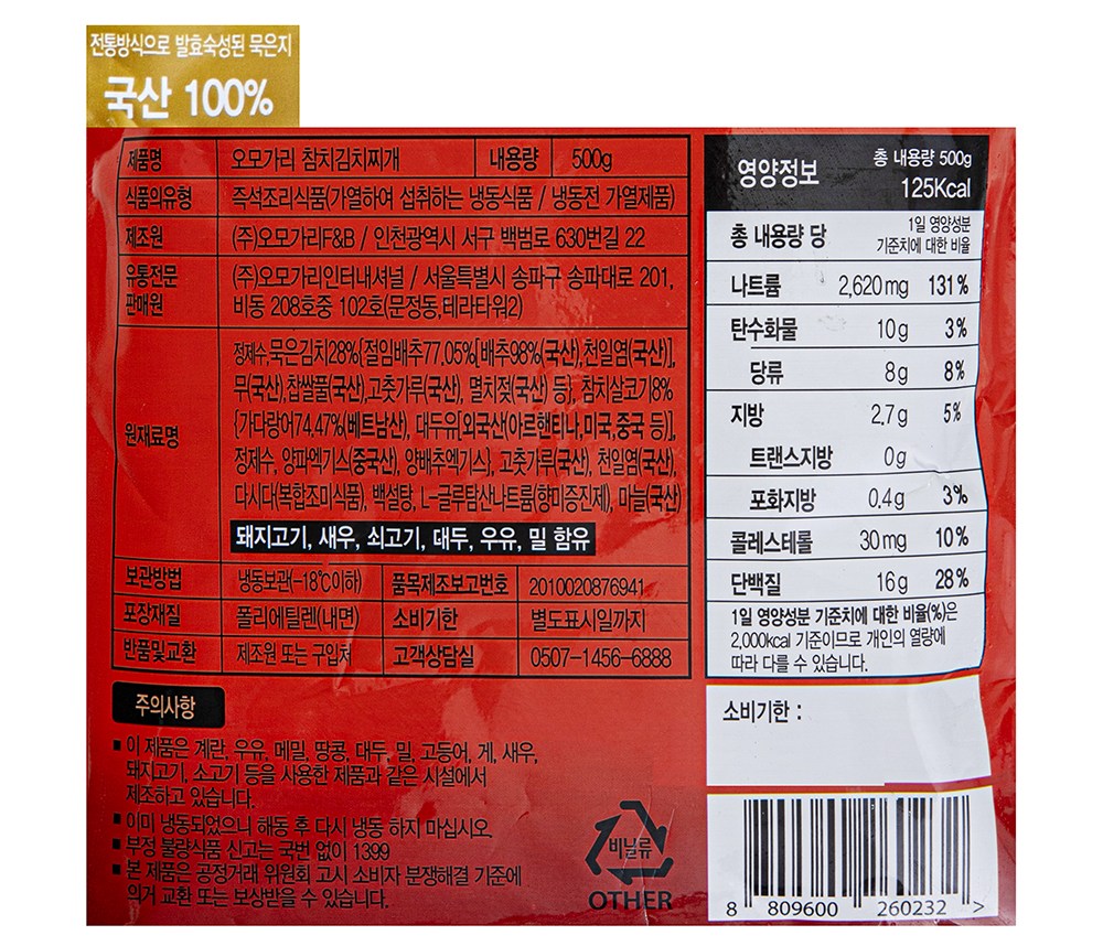 | 제품명 | 오모가리 참치 김치찌개 | 식품의 유형 | 즉석조리식품(가열 후 섭취하는 냉동식품/냉동전 가열제품) |