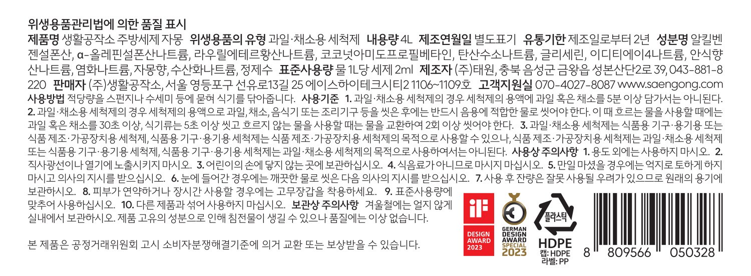 | 품명 및 모델명 | 생활공작소 주방세제 자몽 | 인증/허가 사항 | 위생용품 |