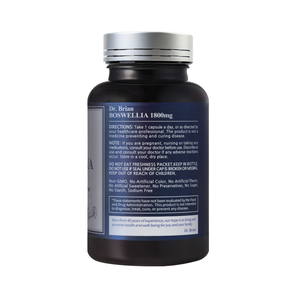 닥터브라이언 보스웰리아는 1회 제공량에 1800mg의 보스웰리아를 함유하고 있으며 삼키기 편한 캡슐 형태입니다.