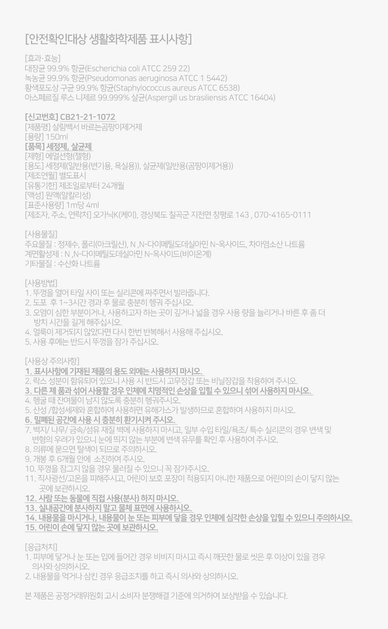 | 품목 및 제품명 | 상품 상세페이지 참조 | 용도(표백제의 경우 계열을 함께표시) 및 제형 | 상품 상세페이지 참조 |