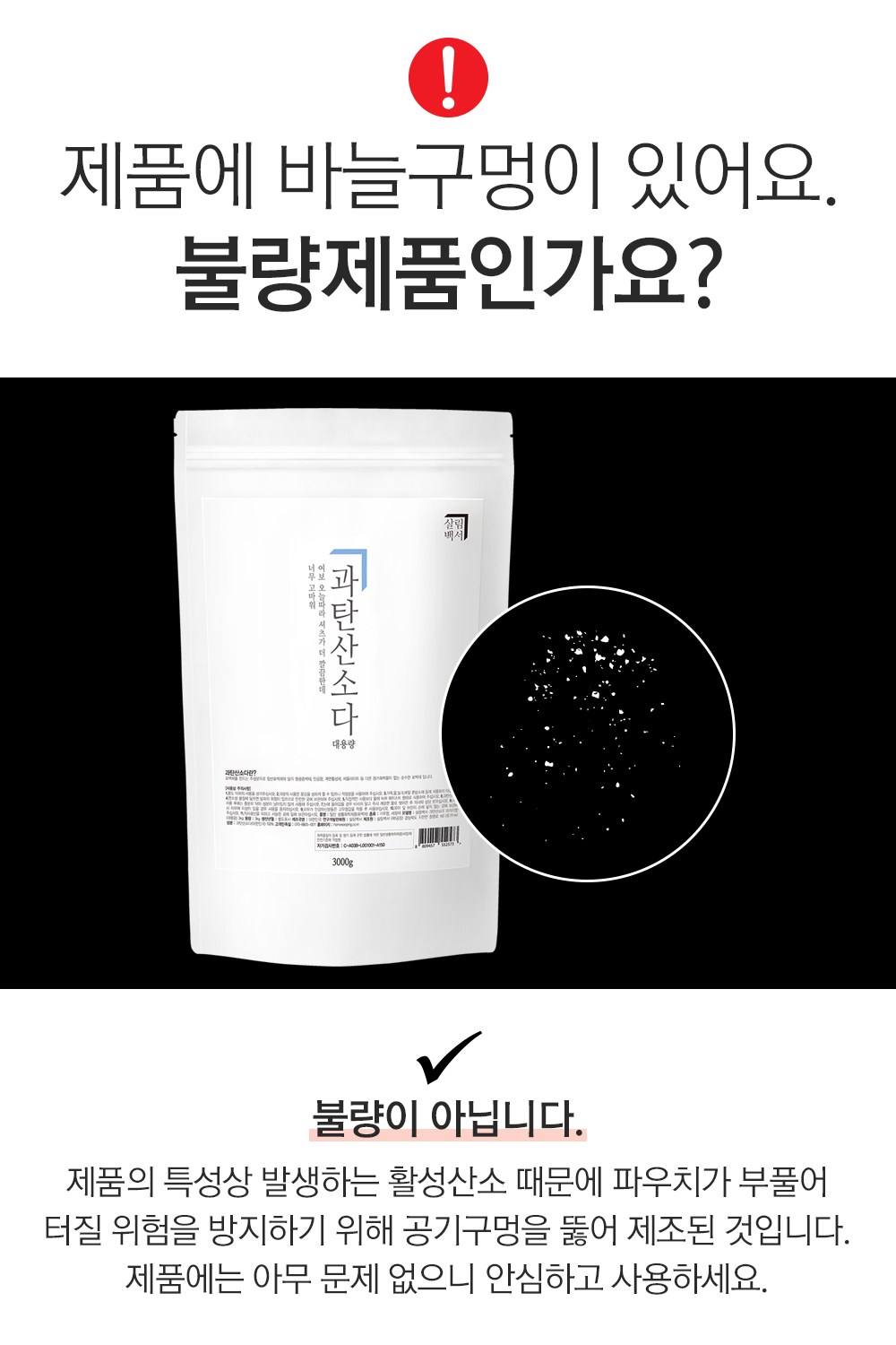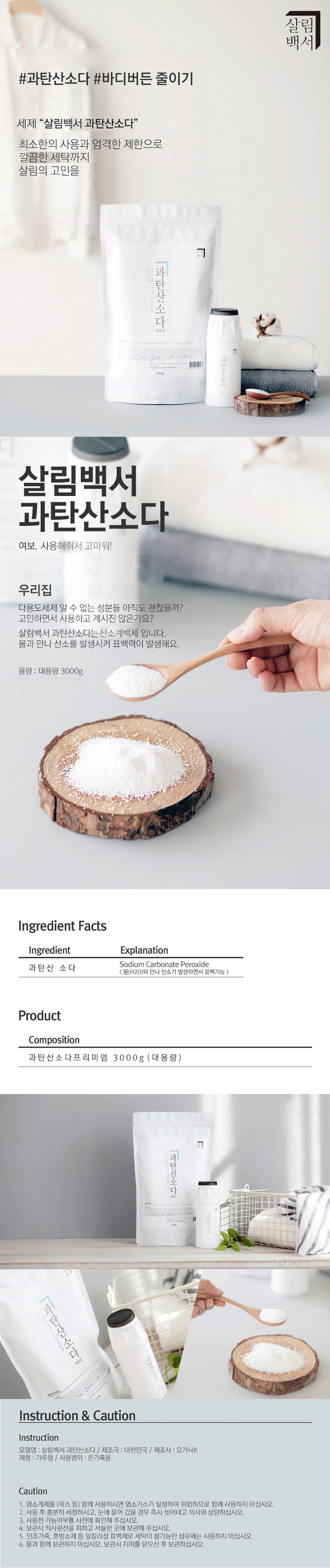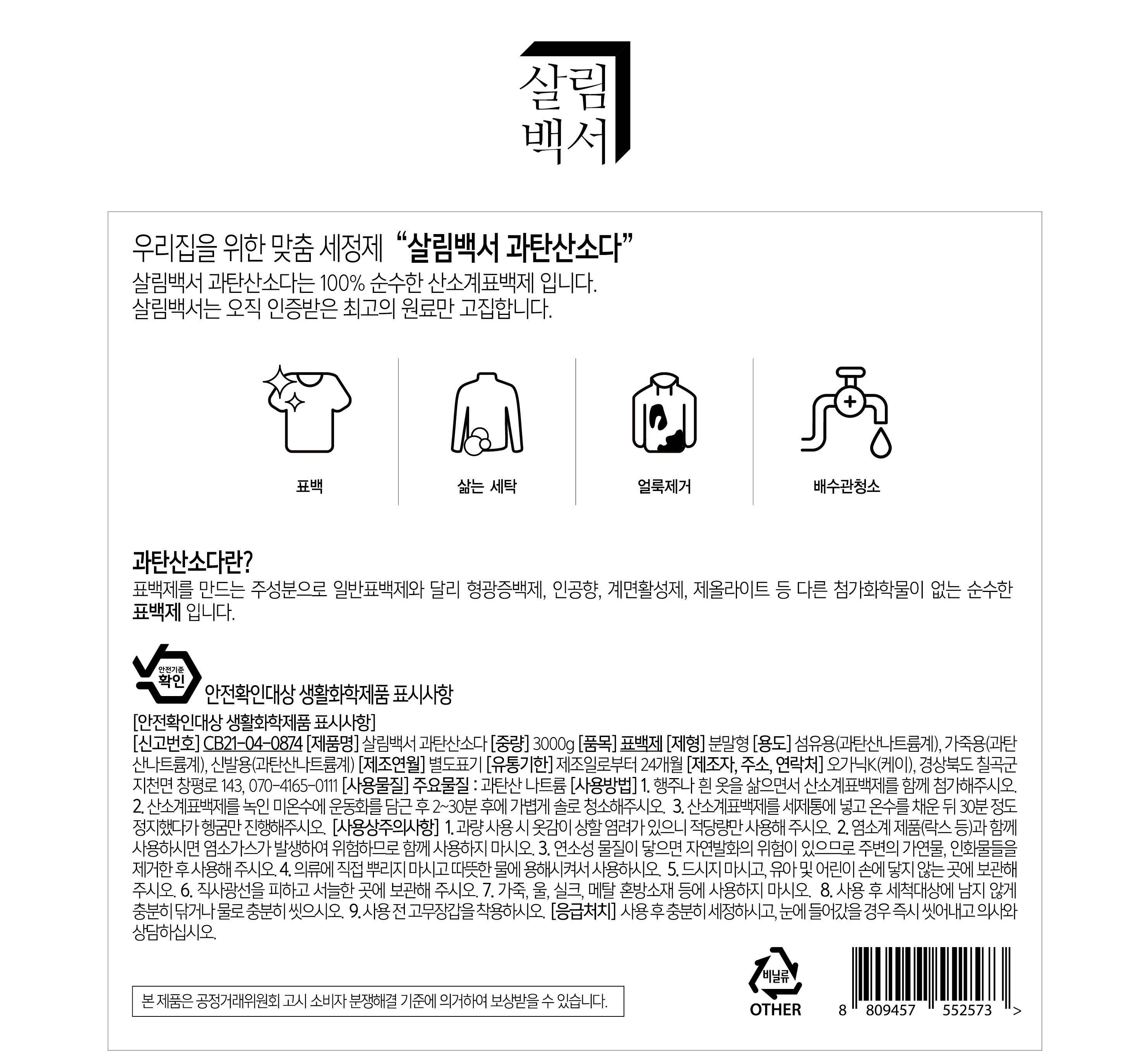 | 품목 및 제품명 | 표백제 / 살림백서 과탄산소다 | 용도(표백제의 경우 계열을 함께표시) 및 제형 | 섬유용-과탄산나트륨계,가죽용-과탄산나트륨계,신발용-과탄산나트륨계 / 비분사형-분말형 |