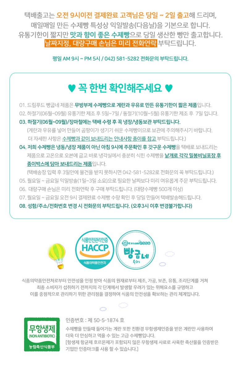 | 생산자 및 소재지 | 농업회사 법인 드림푸드 (드림푸드 빵굽네 생산라인 같음) / 대전광역시 서구 언목재길 387 | 제조연월일, 소비기한 또는 품질유지기한 | ★ 주문 제작 상품으로 상시제조★ 유통기한 - 하절기 6월~9월 제조 후 5일 / 동절기 10월 ~5월 제조 후 7일 [냉장보관시 표시된 유통기한 더하기(+) 2~3일] |