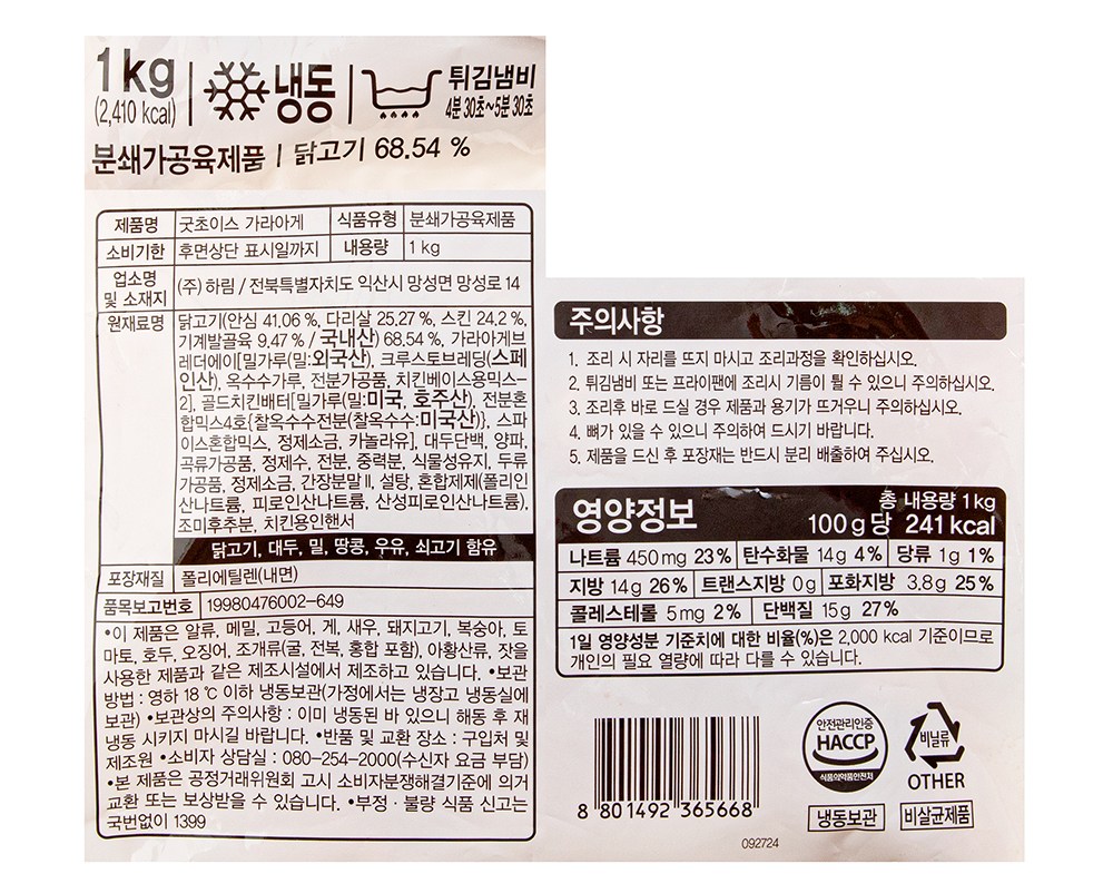 | 제품명 | 하림 가라아게 | 식품의 유형 | 분쇄가공육 |